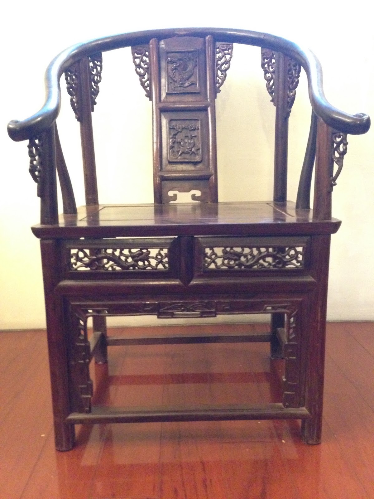 我內心實在很喜歡那完美秀氣比例的造型、簡潔不浮誇的沉穩、迷人寶光的包漿、細膩雅致的雕飾。跟著老闆磨蹭一下午,喝著一杯又一杯的普洱茶。最後,我去7-11那,從提款機裡一次又一次地,提領出最大數額。交給老闆後,咬咬牙頭不回地,開車回家。從後座搬著一對圈椅到家樓下,管理員見我又跑出來說:「哦!又買古董回來了。」我點頭微笑。